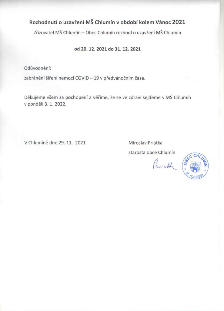 Rozhodnutí o uzavření MŠ Chlumín od 20.12. do 31.12.2021